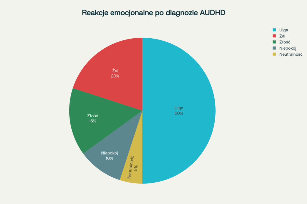 U dorosłych uzyskujących diagnozę AUDHD dominuje uczucie ulgi. Skomplikowana przeszłość „układa się w całość” i „to nie moja wina, to ADHD/autyzm”. W praktyce spotykane emocjonalne reakcje to:
